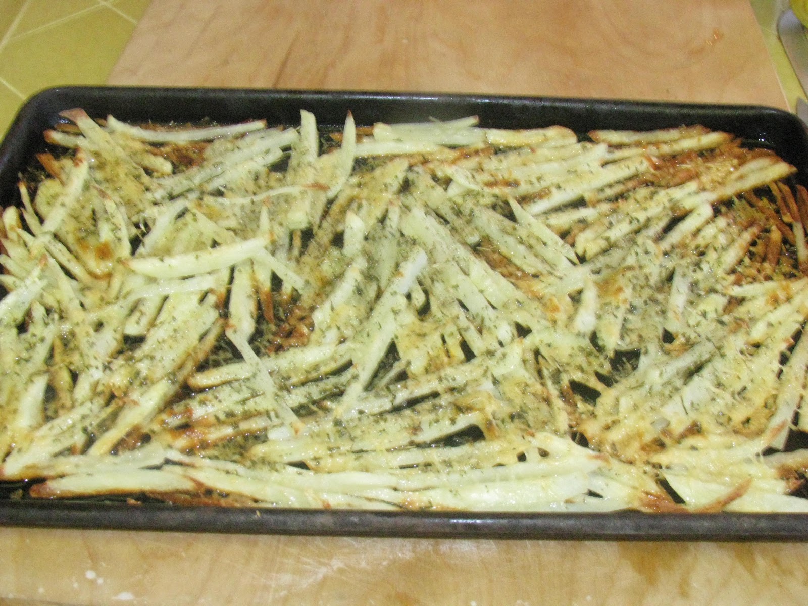I needed another fry recipe....right? That's what I thought when I saw this on an episode of Mad Hungry one weekend. I record them and play the ones that appeal me late at night on the weekends. Lucinda was making hamburgers which is a no brainier but the Italian fries intrigued me. Potatoes sprinkled with Italian seasoning, and then cheese and baked until brown. Mmm yum. Count me in. So I made them one night. The family loved them. I would make them a little thicker. But I crave steak fries as a whole.